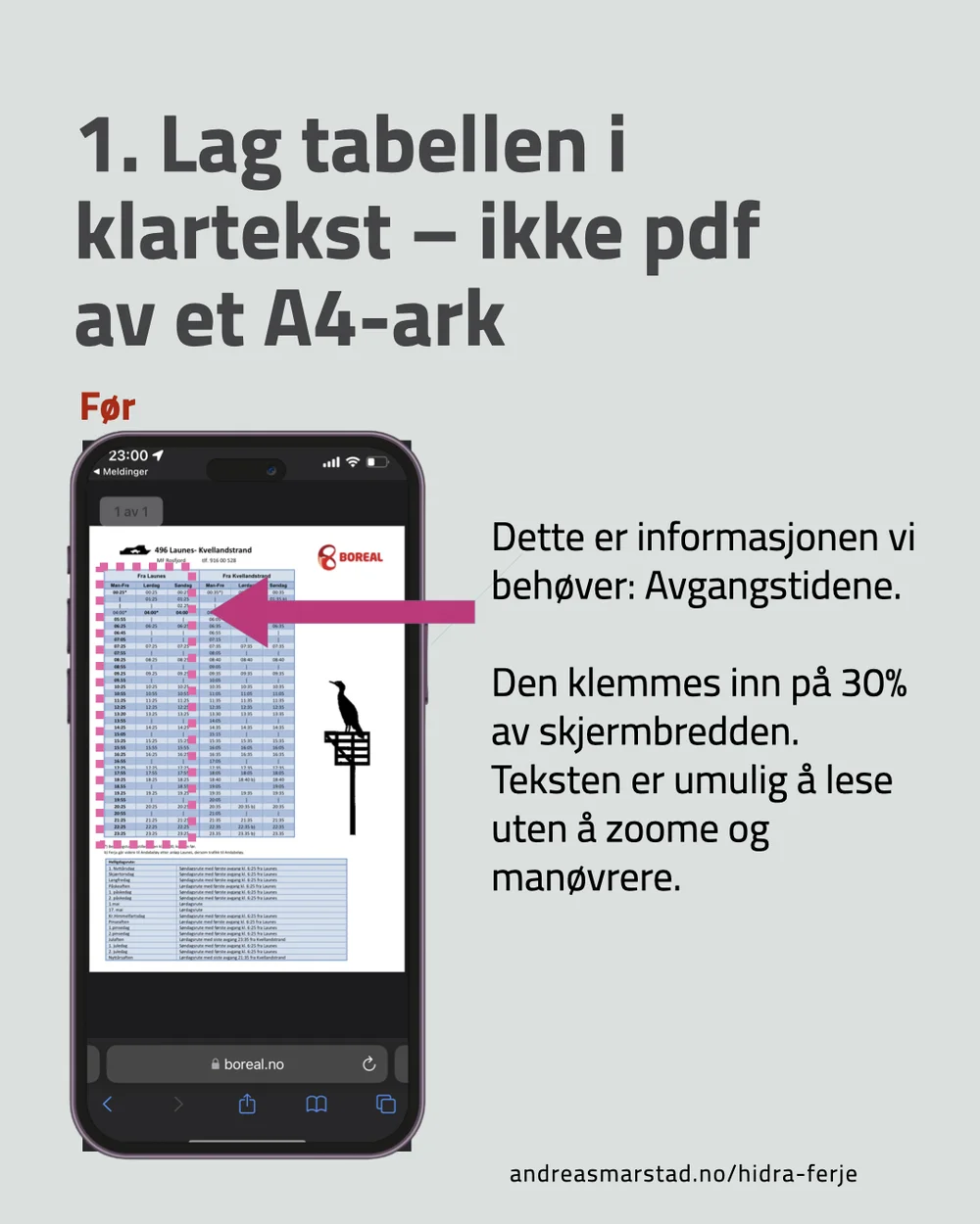 Kan dere ikke bare lede de reisende rett over på en side i klartekst – ingen pdf – hvor de får tilgang til rutetabellen?